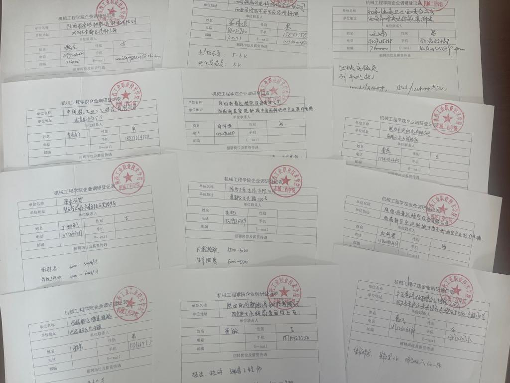 机械学院高度重视本次招聘会,通过现场交流和发放《企业调研登记表》的方式,详细摸底企业招聘需求和岗位要求,深入掌握市场趋势,同时向企业推介了机械学院的人才培养情况及毕业生专业技能和综合素质。并与陕西拓普达精密设备有限公司、咸阳睿阳北宸设备制造有限公司、陕西能安维新能源科技有限公司、瑞仪光电(南京)有限公司、陕西风河新能源科技有限公司等多家用人单位初步达成校企合作意向。希望能借此契机进一步拓宽学院毕业生就业渠道,与相关专业用人单位建立长期合作关系,不断为他们提供人才智力支撑,促进毕业生顺利就业。