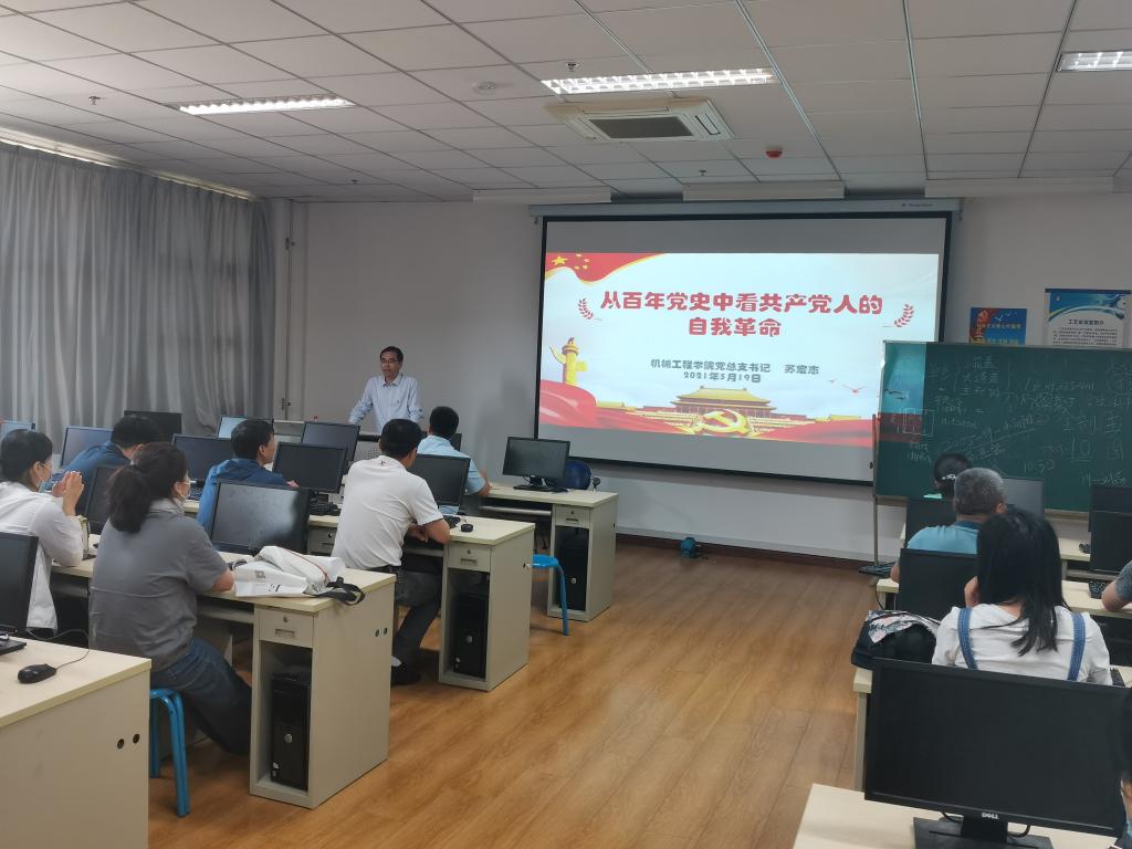 5 20 日下午 在精艺楼2014实训室 ,机械工程学院党总支书记苏宏志为全体党员讲授了一堂题为“从百年党史中看共产党人的自我革命”的生动党课。