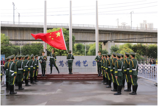 迎着朝阳,国旗护卫队成员迈着铿锵的步伐来到国旗台下,在激昂的《义勇军进行曲》中,鲜艳的五星红旗迎风展开,冉冉升起。全体师生肃立,行注目礼,满怀对祖国无限的热爱和崇高的敬意。