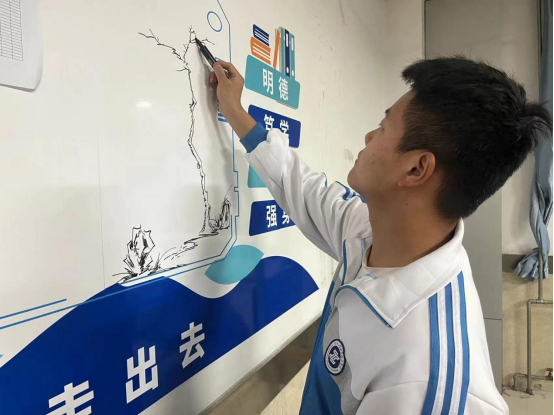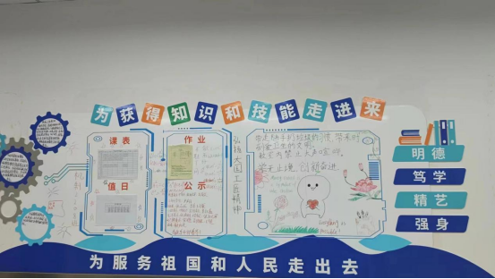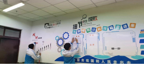 经过各班同学们的精心装扮,教室地面干净,公物摆放整齐,门窗干净明亮,绿植勃勃生机。各班文化墙更是设计精心、图文丰富、色彩鲜艳、寓意深刻,小小的文化墙经同学之手呈现出巨大的文创效果,形成了“班班有特色,处处显文化”的育人环境,也打造了窗明几净的教室环境。