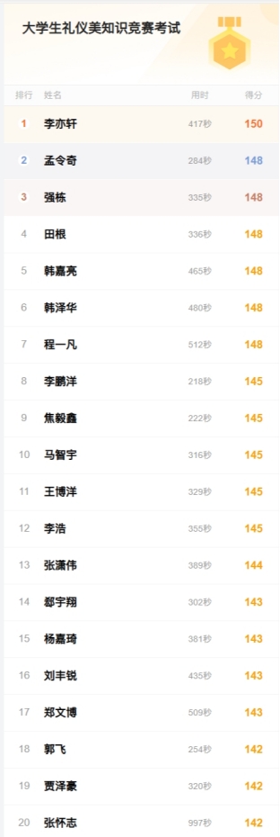 比赛前夕,学生们通过开展班会、阅读书籍、网络查询等方式积极学习有关礼仪美的相关知识,以充足的知识储备迎接本次竞赛。本次知识竞赛采用线上答题的形式,竞赛内容主要围绕文明礼仪的相关知识,考察题型包含单选题、多选题、填空题三个部分,满分共150分。参赛学生进入问卷星参与答题,答题过程中,同学们争分夺秒,在规定时间内完成竞赛。答题完成后,可即刻查看自己的成绩,同学们整体答题情况良好,对礼仪美相关知识掌握情况较好。同学们纷纷表示,通过参加此次知识竞赛,加深了自己对中华礼仪以及礼仪美的认识,坚定了做一名行为美、语言美、心灵美的新时代青年的决心。