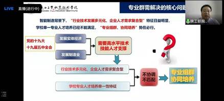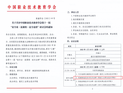 2022年1月10日,由中国职业技术教育学会主办,重庆工业职业技术学院承办的第十一届“说专业•说课程•说专业群”研讨会以线上、线下相结合的方式举行,我院机械制造与自动化专业群受邀参加此次会议,专业群带头人赵明威教授在“说专业群”板块进行主题发言。