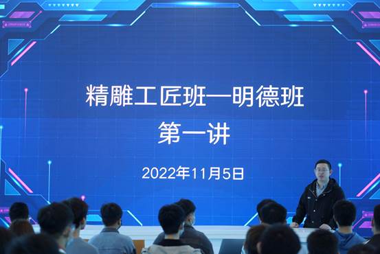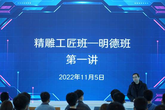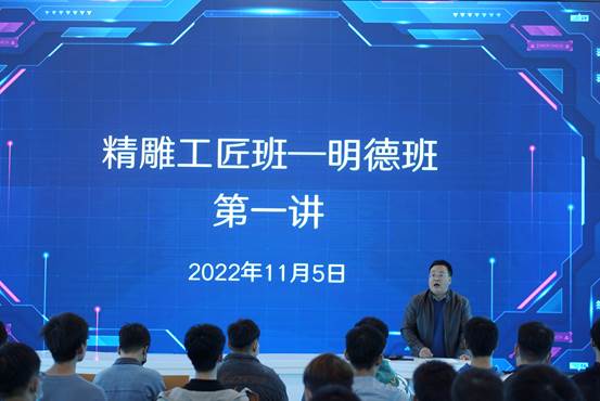 2022年11月5日,第三期“精雕工匠班”在先进制造精雕产业学院数字化展厅举行了开班“第一讲”。此次活动由产业学院企业负责人王帅主持,机械工程学院院长赵明威、党总支书记苏宏志、副院长刘艳申校企双团队共同参加。开班第一讲首先由赵明威院长授课,他通过三点强调了制造行业对于中国的重要性,第一点说的是制造业是“立国之本、强国之基”的国家定位,第二点说的是在“精雕班”学习要有吃苦耐劳的精神,第三点说的是现阶段制造业人才需求呈现“多元化、复合型、创新性”三大特征;随后苏宏志书记以学生要做一个“明白的学生”为核心,督促学生要明白为什么要学、要学什么,要怎么学,学成后要干什么,期盼学生能学好技术、用好技术,层层“打关”,完成“精雕工匠班”的全部学习任务和考核任务,随后企业导师就“精雕工匠班”三年教学的安排以及教学过程中注意事项进行了介绍,重点强调了“精雕工匠班”着重培养高水平技术技能人才,拥有非常严格的淘汰机制,随后分组带领学生参观先进制造精雕产业学院,实景讲解现代化制造体系、先进制造设备和典型精密加工零件。