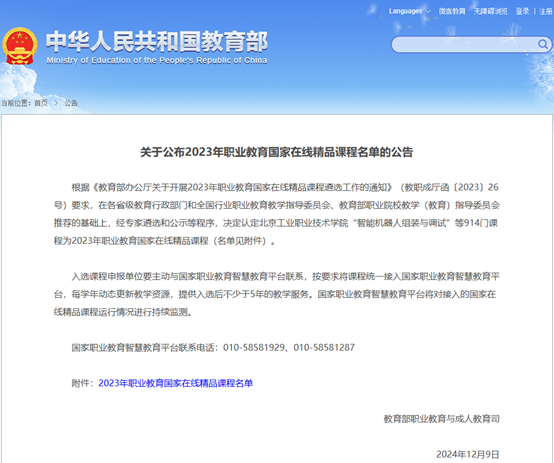 我院1门课程荣获2023年职业教育国家在线精品课程