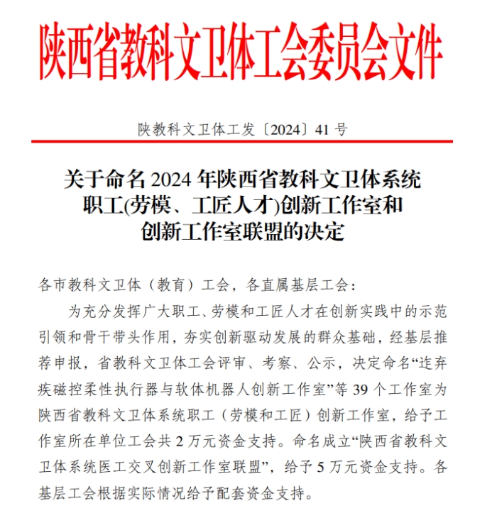 近日,陕西省教科文卫体工会委员会印发《关于命名2024年陕西省教科文卫体系统职工(劳模、工匠人才)创新工作室和创新工作室联盟的决定》(陕教科文卫体工发〔2024〕41号),我校王建军先进制造创新工作室获陕西省教科文卫体系统“职工(劳模和工匠)创新工作室”荣誉称号。