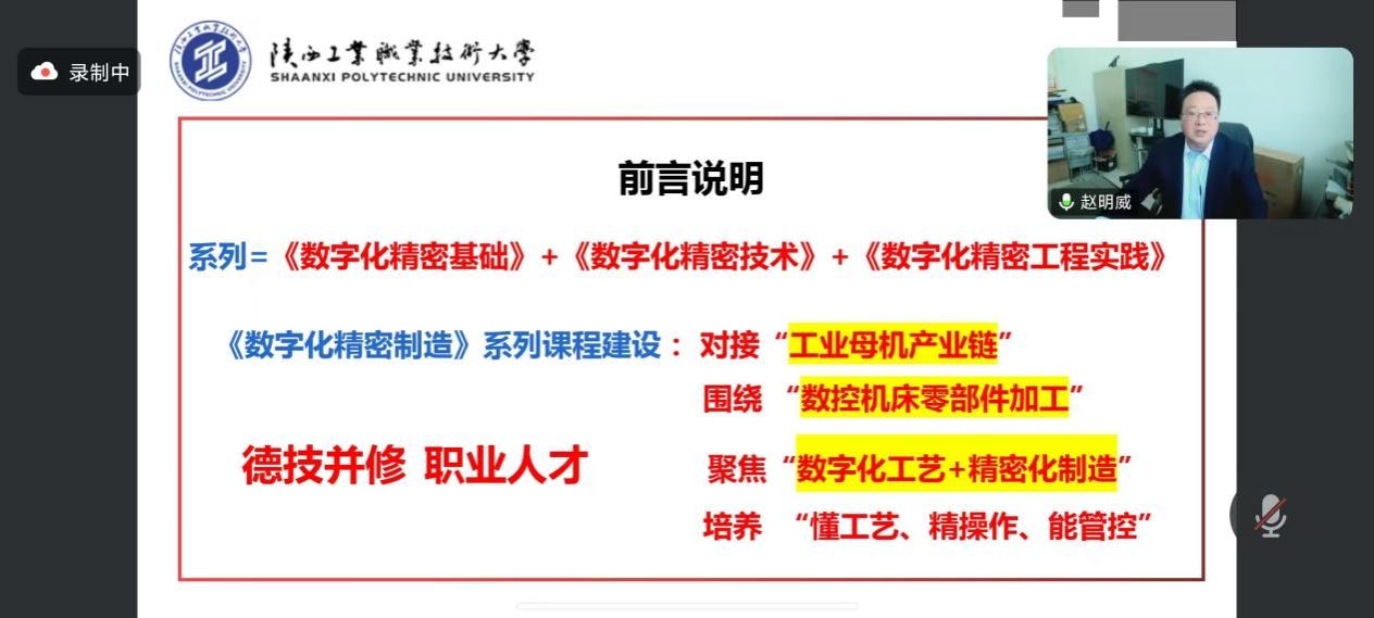 为推动职业教育装备制造大类课程思政建设,深化课程教材思政建设,深入学习领会党的二十大精神,贯彻落实全国教育大会精神,根据教育部职业教育与成人教育司《关于开展2025年职业教育课程思政集体备课的通知》(教职成司函〔2025〕10号)要求,全国机械职业教育教学指导委员会于10月28日举办2025年度职业教育装备制造大类(机械类)课程思政集体备课会,聚焦装备制造大类核心课程教材项目任务,探索思政元素有机融入知识、技能及案例设计,全国6位职教领域骨干教师受邀做线上集中备课展示,我校三级教授赵明威同志以《数字化精密制造系列课程说课与展示》为主题做开场分享。