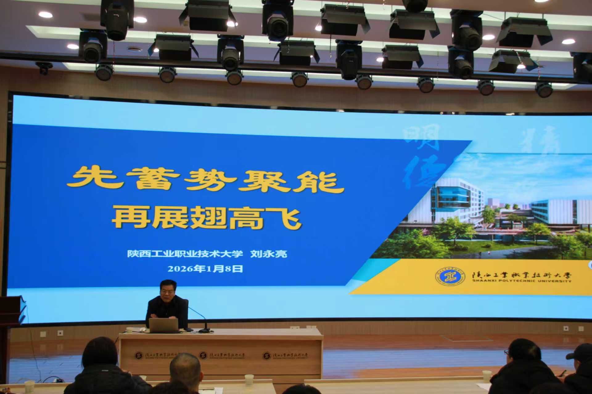 2026年1月8日,陕西工业职业技术大学校长刘永亮在学术会堂开展了一场主题为“先蓄势聚能,再展翅高飞”的职业规划讲座,讲座聚焦学生就业与成长关切问题,通过信念引领、责任唤醒、资源赋能、实操指导等方式,为在校生释疑解惑、明晰方向,助力学生勇敢迈向职场。本次讲座由机械工程学院党总支书记侯涛主持,机械工程学院全体辅导员,2024级、2025级480余名学生及就业处全体老师参加。