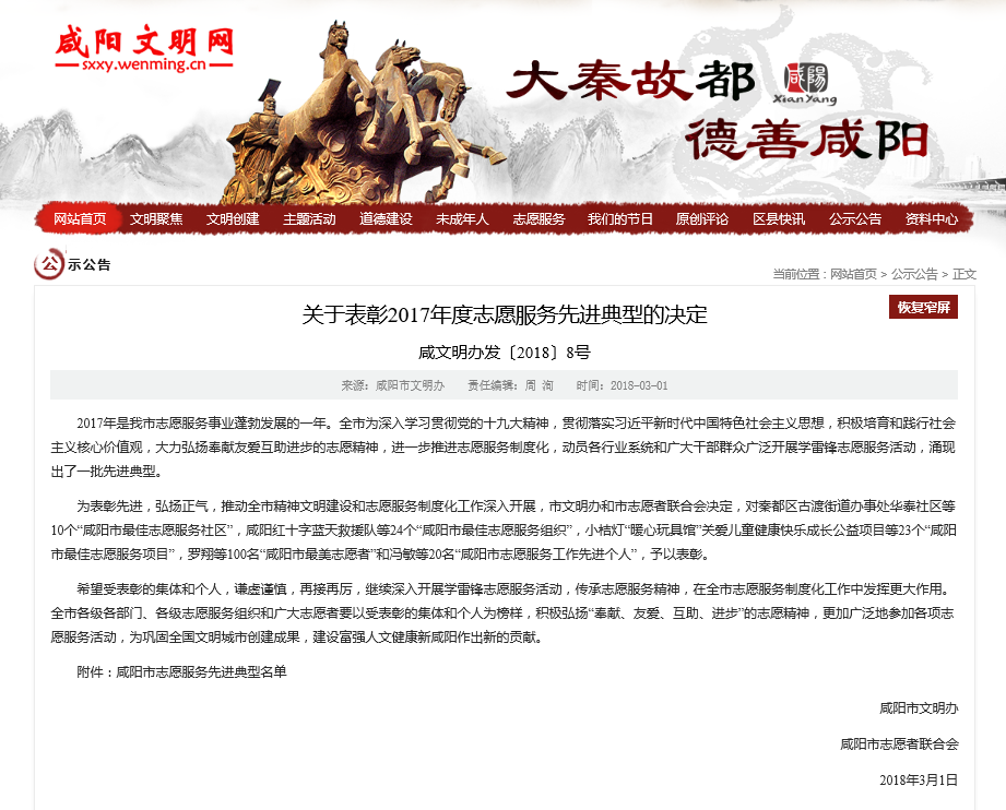 3月2日上午,咸阳市志愿服务表彰暨“志愿服务新征程咸阳文明我先行”百万志愿者在行动活动启动仪式在统一广场举行。咸阳市人大常委会副主任刘勇锋出席,副市长孙亚政讲话并宣布活动启动。会上对2018年全市志愿服务工作进行了部署,并对2017年咸阳市志愿服务先进典型进行了表彰。我院“清斗活动”志愿服务项目获2017年度咸阳市最佳志愿服务项目,钟晓书同志获2017年度咸阳市志愿服务工作先进个人。