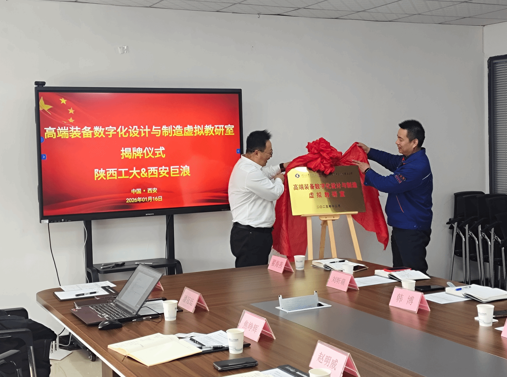 在揭牌仪式上,双方领导共同为“高端装备数字化设计与制造虚拟教研室”揭牌,标志着校企双方在高端数控机床领域的合作迈上了新台阶。