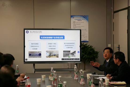 机械工程学院院长赵明威首先汇报了先进制造精雕产业学院的建设情况。在建设情况汇报中,赵院长分别对数字化制造技术技能培养平台的搭建情况、学作创一体化人才培养模式创新、人才校企协同培养和产业学院运行机制进行了介绍。其中,数字化制造技术技能培养平台依托产业学院,现已完成数字化仿真中心及数字化制造中心的构建,用于零件的设计、加工工艺编排、制造仿真、精密制造、仿真验证及质量检测,实现制造数据从设计端发起,经过优化迭代与验证,最终反馈至设计端的闭环过程。针对学作创一体化人才培养模式,现已完成了课程体系的设计与项目化活页式教材的开发。校企协同成立精雕学徒班,承办了“精雕杯”数字化仿真制造技术赛项,以赛促教、以赛促学。随后,赵院长对产业学院下一步工作计划进行了汇报,希望继续完善数字化制造技术技能培养平台的搭建、丰富学作创一体化课程资源、深化校企协同培养与技术服务、继续试点产业学院运行机制,并表达了产业学院服务制造强国战略、支撑地域行业发展的美好愿景。