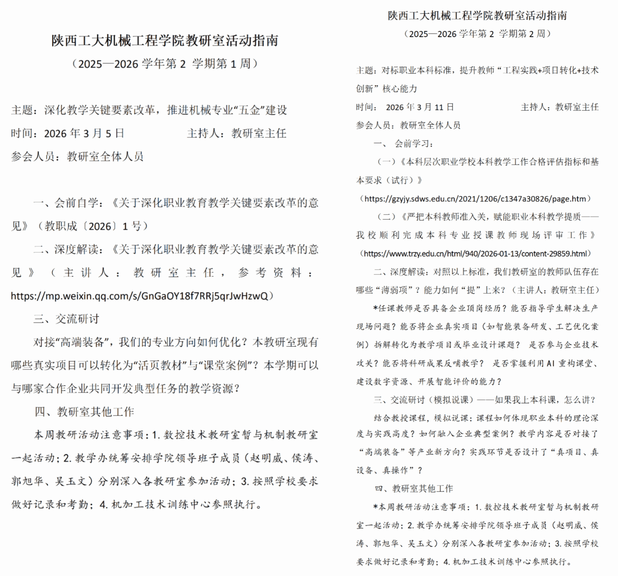 近日,机械工程学院发布《2025—2026学年第2学期教研室活动指南》,各教研室通过政策学习、专题研讨等形式开展专题活动,旨在明确产教融合实施路径,提升人才培养质量。教学办统筹安排学院领导班子成员分别深入各教研室参与活动。